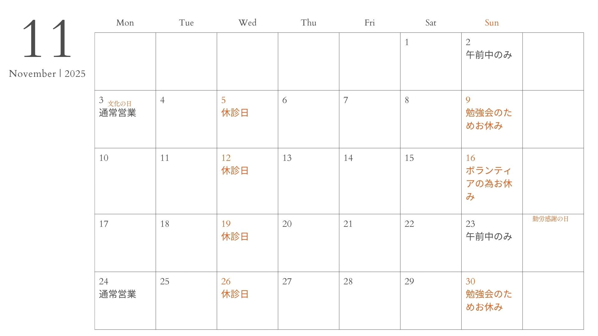 11月の当院の営業カレンダーです。ご予約の際にご参照ください。