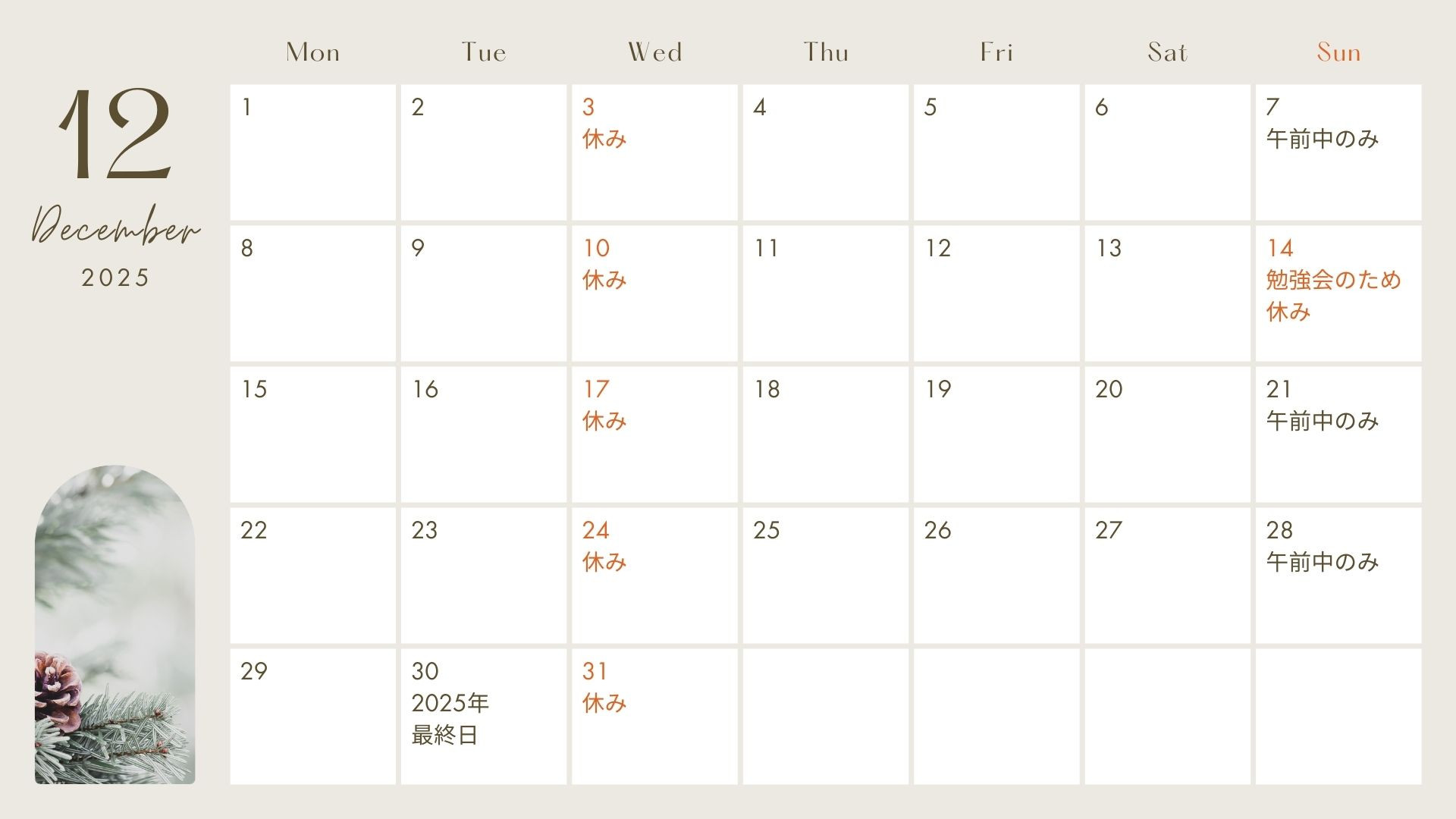 12月の当院の営業カレンダーです。ご予約の際にご参照ください。